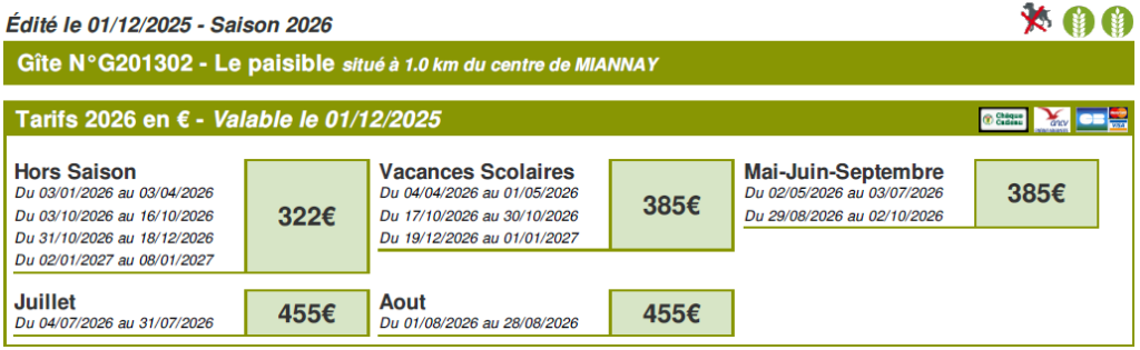 électricité au delà du forfait de 8kwh/jour (0.193€TTC/kwh heures creuses et 0.310€TTC /kwh heures pleines), location de draps : 10 €/lit. Caution 400€ Caution ménage en option à verser à l’arrivée: 40 €. Taxe de séjour: 0.33€ x jour x personne